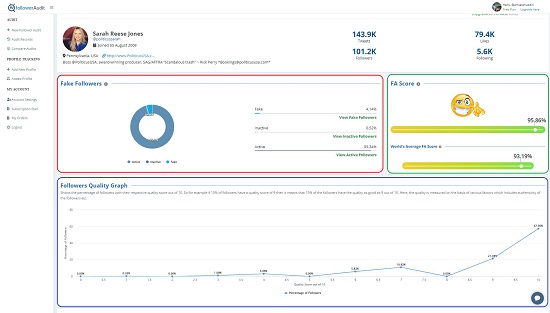 The audit gives you the percentage of Fake Followers along with Follower Quality Distribution and a SparkScore that rates the Twitter account for Reach and Influence on a scale of 100.