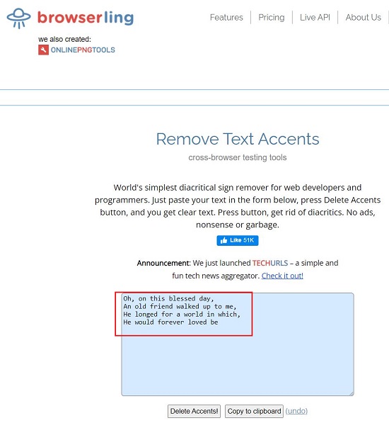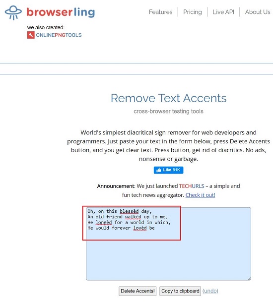 This is yet another simple tool to eliminate diacritical marks from text easily and quickly. It has been made available by Browserling who are also the creators of the famous PNG utilities website namely, OnlinePNGTools.
