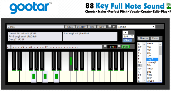 Gootar is also a free piano generator website which allows you to easily generate piano chords. You can just open this website and then you will see the options to choose the root key and chord type on the left of the keyboard. After you select a key and chord type, it will automatically generate the chord and you will see it highlighted on the keyboard. Apart from that, you can play the chord just by clicking on the “Play” button. This website does have a limitation where each session will last only for 5 minutes. After that, you would need to restart another session for generation piano chords.