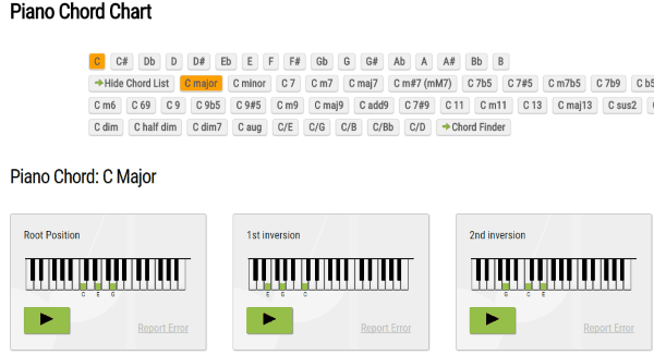Piano Chord Chart by 8notes is another simple piano chord generator which you can use for free to generate piano chords. As soon as you open this website, you will be able to see all the major keys at the top among which you can select anyone you like. Then you will find all the chord types by clicking on the “Show all chords” button. Now, you can choose the required type and then it will instantly generate the piano chord. You can see the chord on a keyboard and even play it if you want. For some chords, it also shows multiple inversion positions.