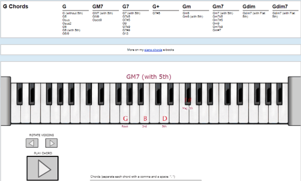 Piano-Chords also allows you to generate piano chords online just by selecting a key and a chord type of the piano. When you open this website, you will see a keyboard diagram at the top with written keys on it. Now, select any key you want and then the chord types will appear. You can then choose any chord type you want and it will use your selection to generate the piano chord automatically. After that, you will also see an option to rotate the voicing of the chord and see its different position. You can even play the chords directly on the website.