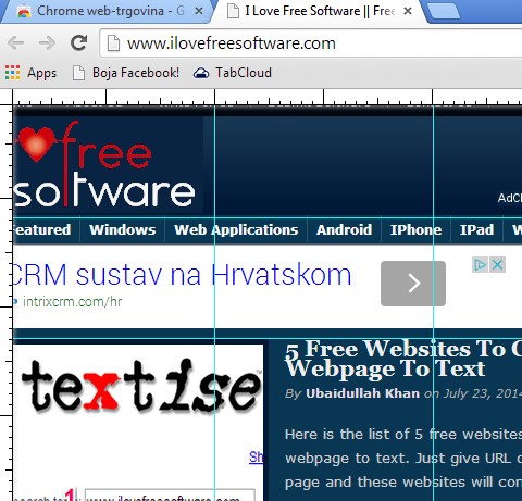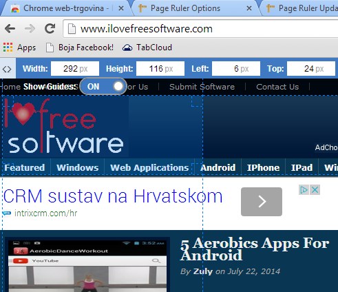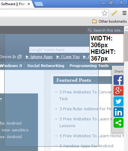 It works more like the Photoshop ruler, in other words it uses grids in order to single out the website segments that you need measured. Along the edges of the website window there’s a ruler from where you can call up the lines. To find out a size of a certain grid section just click on the intersection between two lines.