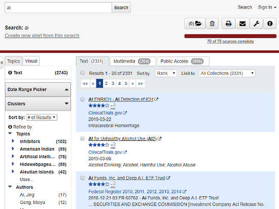 You can sort the results in all these sections either by ranking or by categories. On the left side, you can filter out the results by date range and view topic cluster related to your query. And, you can email or print the results as well.