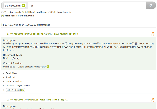 In the results, it lists the title, authors, year of publication, etc. for each result and shows a un-locked icon to resemble the open access document. From there, you can view a document in detail, email it, add to favorites, check in and Google Scholar. Furthermore, you can also export the records to any of the following formats: