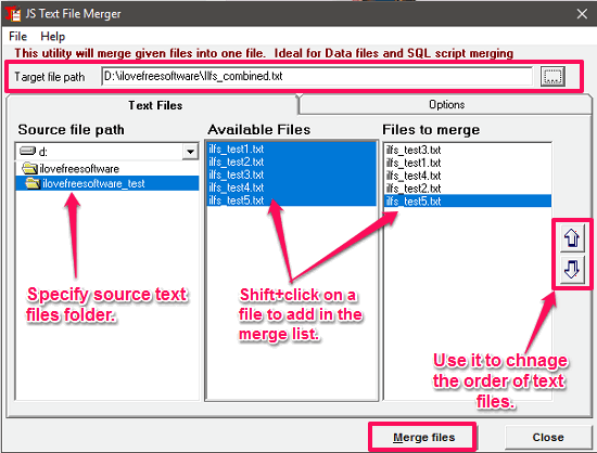 Here are 5 free software to merge text files. Using these free software, you can select multiple text files from a directory and merge them into single text file. Also, you can add a separator in some of these software. If you want to change the order of the text files in the final combined file, then you can do that too. Not only text files, some of these text file merger software can also merge files of different formats such as DAT, INF, LOG, XML, INI, files.