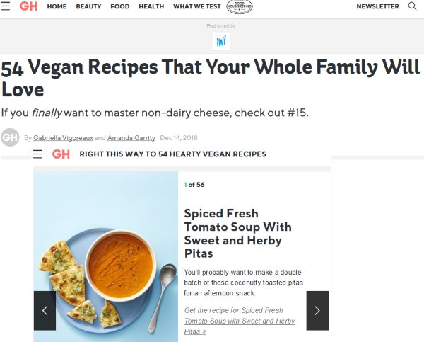 Good Housekeeping is a popular website for a lot of things related to home including healthy recipes. They also have a dedicated section for easy vegan recipes. The website lists 54 easy vegan recipes, which are presented in the form of a slideshow on the website. There is a beautiful picture of the dish on the left and right side has the name of the dish and a brief description. Below the description is a link to get the recipe. When you click the link, the recipe page will open with the dish photo on the top followed by ingredients, directions to cook, preparation time, total time, servings, and calories. You can also make a shopping list with the mentioned ingredients and email it or message it to yourself. So this list will be available to you when you go grocery shopping.