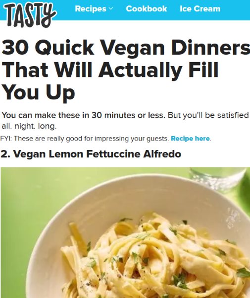 Tasty is a food website with a dedicated section for easy vegan recipes. The recipes are listed with beautiful pictures and a link below it for the recipe. When you click the link the recipe open up with the ingredients and method of cooking. Apart from that you can also find preparation time, cooking time, difficulty level, servings, etc. You can also see the ratings of the recipe by other users. The recipes are all hosted on Food Network and you will be taken to that website when you click on get recipe link.