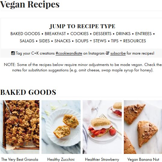 Cookie and Kate is a food website, with delicious vegan recipes. You can scroll through the vegan recipes section, the recipes have been divided into categories like breakfast, entree, desserts, etc. When you click on a recipe it will open up in full page. The recipe will have a list of required ingredients, instructions on how to cook, preparation time, cooking time, servings, calories, etc. Do read the notes section in the recipe given at the bottom, as some recipes marked as vegetarian require minor adjustments to make them vegan.
