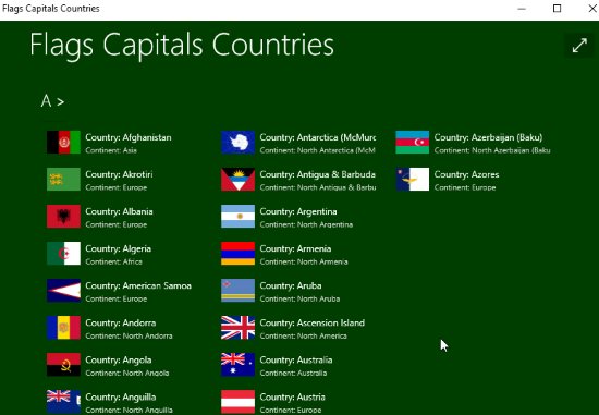 Flags Capitals Countries is a free Windows 10 flag app. In this app you will see an interface like the one shown in the screenshot above. All the countries, their flags, and which continent they belong to is listed in alphabetical order. You can browse all the countries and their flags or you can even directly go to the ones you want. When you click on the name of a country, it will open up in full screen, as shown in the screenshot below.