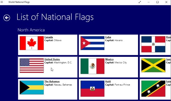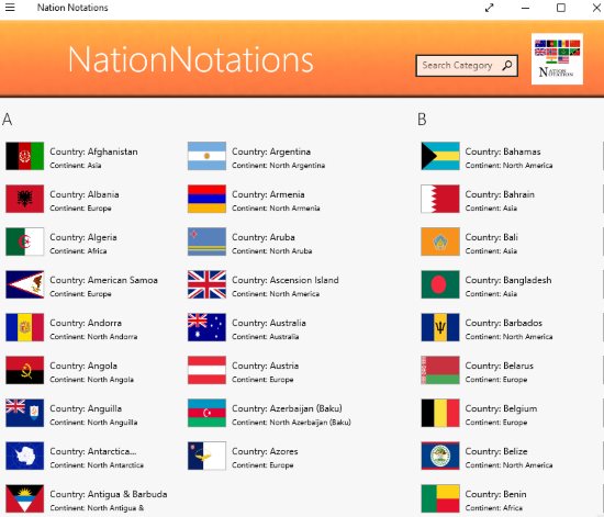 Nation Notations is a free Windows 10 flag app. The interface of this app can be seen in the screenshot above. In this app all the countries are listed in alphabetical order starting from A. You can click on any country name and it will open up in full page showing the countries name, capital of the country, the continent it belongs to, the native language spoken in the country, and the flag of the country is displayed. You can also see a search option at the top of the page, from where you can search for any country name and directly go to it, instead of browsing through all the countries.