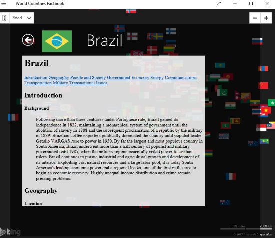 This page will list the name of the country, the continent the country belongs to, the capital of the county, native language spoken in that country, the flag of the country, and its location will be shown on a map towards the right side of the app window. You can share this information with your friends through various ways and can also pin this to the start menu.