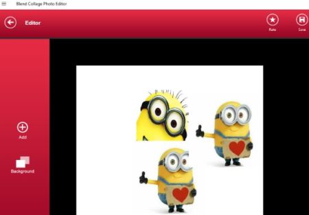 Blend Collage Photo Editor is a free collage maker app for Windows 10. In this app you will start off with creating a collage button on the home page. After that a browse window will come up asking you to select photos that you want to include in your collage. Search and select photos to be included. Once you do that the photos you selected will open up in the collage interface. You will notice that it is a free form collage and there are no grids or anything like that available in this app. You can change the position of the photos as they appear in the collage. After doing that click on the add button on the left side of the app window. This will allow you to add more photos or even add text to your collage. Apart from that you have a background option which will let you add a colorful background to your image which can be in texture format, in solid color, or custom image background. Once all that is done you can go ahead and save your collage on your computer. The collage will be saved in .bmp format.