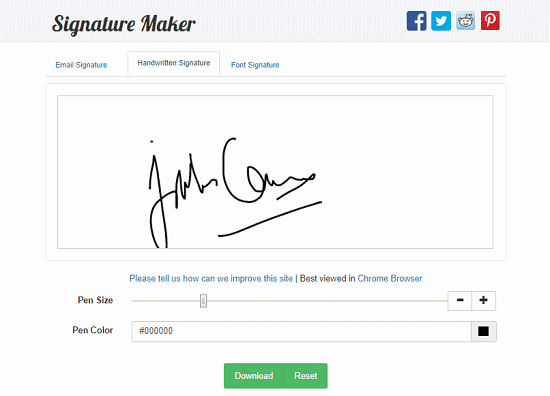 If you are not satisfied with your signature or made a mistake, just click the “Reset” button to try again. When you get it right, you can download your signature as a PNG image with transparency.