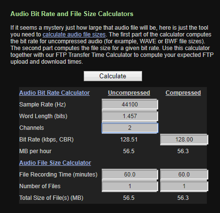 As the name of this tool indicates, you can also use it to calculate the size of audio. Enter the file recording time (in minutes), number of files in that audio, and it will show the size of audio files, both in compressed and uncompressed modes.