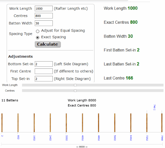 Once you add such details, you can get the calculations. You can also adjust work length and centers using the sliders and the output will come accordingly. In the output, it will show number of battens needed to cover work length, center (or space values), last center value, etc. It also shows if last center space is not fit (based on exact spacing), then a batten will be added which will reduce last center space.