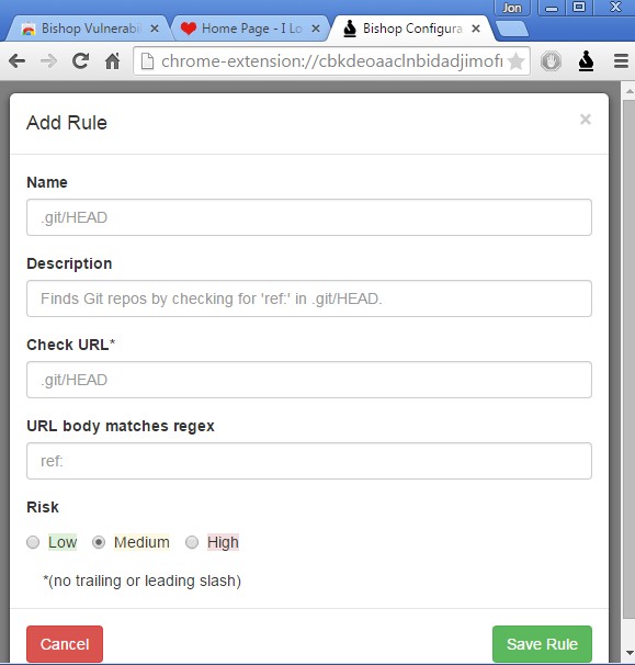 Bishop Vulnerability Scanner lets you setup your own vulnerability scan rules, but the extension by default comes with a few pre-configured ones that can help you find more common exploits on websites.