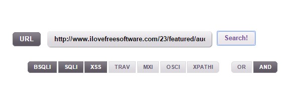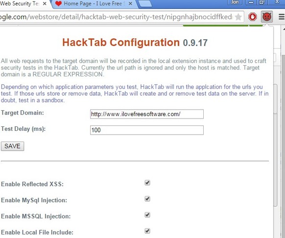 HackTab Web Security Tests checks websites for 4 types of problems, MySql injection, MSSQL injection, local file include vulnerabilities and for possible exploits caused by cross-site scripting (XSS).