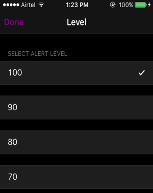 Step 3: After that, go back and select the option “Alert level” to set the battery level at which you want to get the notification. By default, you will get notified when the battery is full charged. You can also select a different level for the alert sound to play. Once, you’re done selecting a sound and alert level as 100%, just keep the app open while charging. Each time the battery level is full, this app will notify you by playing the selected sound.