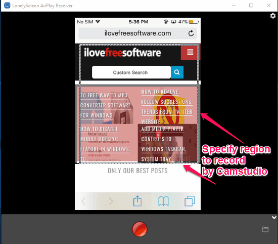 In this tutorial, I will explain how to record specific iPhone screen area. The method requires a couple of steps and isn’t straightforward as you would expect. In the first step, I will mirror the iPhone screen to the desktop using LonelyScreen and after that, I will use a screen recorder software named CamStudio to just capture a specific region of the iPhone screen. This might not be the direct solution but it is the only way to record a specific area of an iPhone screen that I was able to find. Using CamStudio, you can record the specific area of iPhone screen being mirrored on the PC and save it as an AVI file. Well, you can use any other screen recorder software of your choice as the concepts remain the same i.e. record specific desktop area where your iPhone screen is being mirrored.
