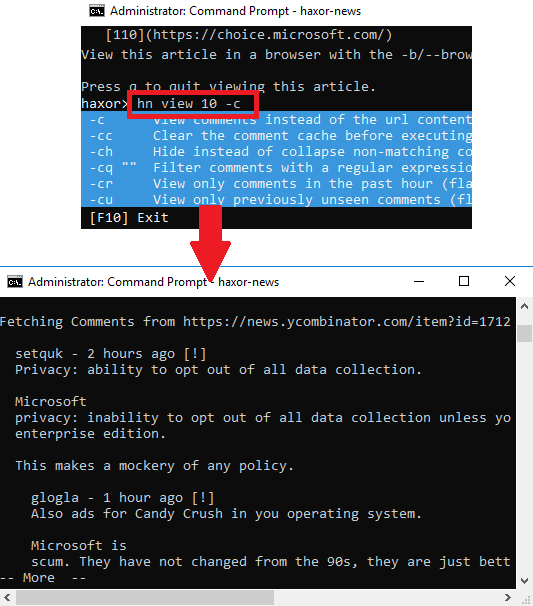 Haxor-news is a free Hacker News command line client for Windows. It lets you browse the Hacker News website right from the command prompt or the terminal of your PC. It shows the Hacker News interface in the command prompt and you can read the posts, their titles, web-linked content, comments, etc., easily. Not only this, if you want, you can even export the comment on a specific post to a TXT file. It lets you browse the news sections like New, Top, Jobs, etc and you can read the post on the original page as well. It lets you open the links and then show you the full post in the terminal itself.