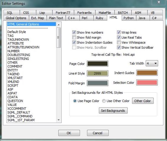 - Supports many popular programming languages including HTML, ASP, C/C++, C#, Java, VB, Python, Ruby, Pearl, CSS, SQL, Asm Fortran, Lisp, PHP, Make files, Batch files, and Text files.