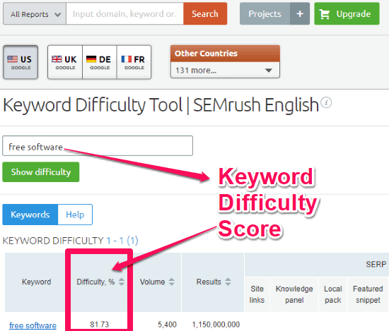 SEMrush is another free online keyword difficulty tool on my list. Similar to other free SEO difficulty tools on my list, it can tell you how difficult can it be for you to get a page ranked on the first page of Google search results for a specific keyword. It indicates the SEO difficulty score from a percentage of 1 to 100 where higher percentage means higher SEO difficulty to rank for that keyword. It calculates this score based on the authority levels of the domains that appear on top of the SERPs for that keyword.