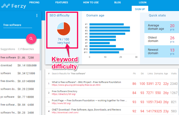 Ferzy is the first free online keyword difficulty tool on my list. Next time, when you think to write a blog post, I will recommend you to spend some time with this free SEO difficulty tool as it can tell you the SEO difficulty score of the target keyword with which you want to optimize your blog post. This SEO difficulty score is calculated by analyzing following metrics of domains on the first page of SERPs: Domain Authority, Page Authority, Domain age, and estimated visits to these domains. You can even find this SERP analysis report on its search results page, as shown above. At the same time, you can also analyze your competitors for the same keyword and get to know about their Page Authority, Domain Authority, Domain age, and estimated visits to these pages. The best part is that it also shows other variations of the searched keyword with their CPC and searches. In addition to that, you can also select a region or country to find keyword difficulty and searches to target that specific region only. You don’t need to signup or login to use free keyword difficulty tool of Ferzy, visit the link provided above and get started. All you have to do is specify a keyword and select a region to find its SEO difficulty score, as shown in the screenshot above. It indicates the keyword difficulty score from a scale of 1 to 100 where a higher number represents higher SEO difficulty. The main limitation of Ferzy is that in its free version you can only perform 10 searches per 24 hours to find keyword difficulty score.