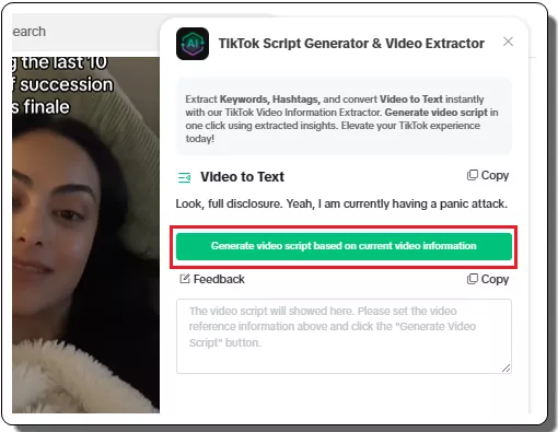In this post, you I will explain how to generate video scripts from existing TikTok videos. TikTok Script Generator & Video Extractor is a free Chrome extension that analyzes a given TikTok video and then helps you generate a video script based on it. It analyzes the transcript of the current video and gives you a complete script that you can follow to create the exact same video yourself.