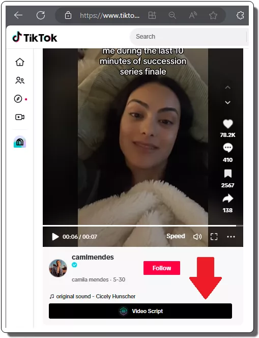 Now, open any TikTok video that you want to recreate. When the video starts playing, you will see a new icon added by the extension as shown below. It has “Video Script” name.