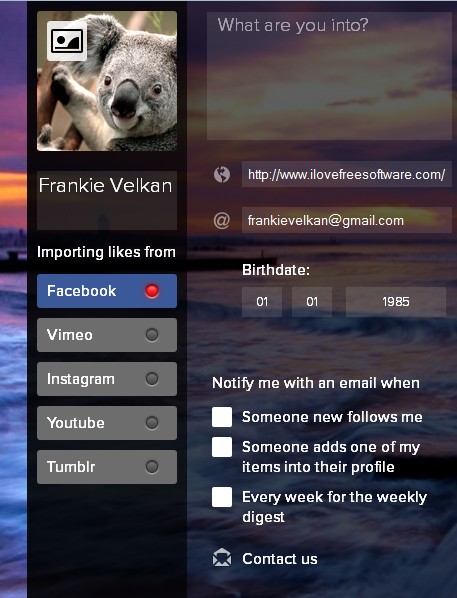 Perso.na is a free social network combiner where you can connect and combine 5 different social networks and content sharing services into one profile, your very own online persona. You can connect with Facebook, Vimeo, Instagram, YouTube and Tumblr. Once that you connect one or more of these, Perso.na will pull all your likes, shares, favorites and create a combined, unified profile out of activity from all of the aforementioned social networks.