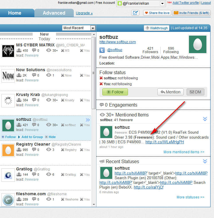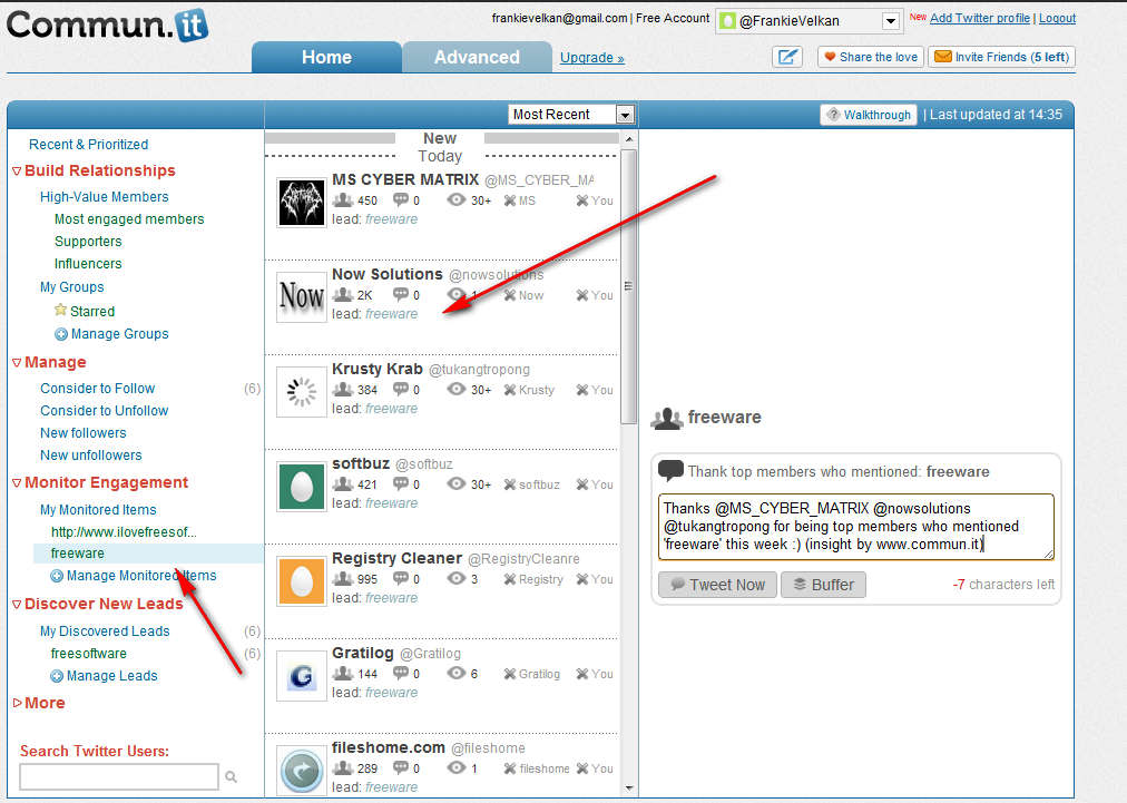 Notice in the left sidebar that you have an option for Managing Monitored Items. One of the drawbacks of the free account would be that you can only have two items, which are basically keywords that are gonna be searched while you are looking for new relationships on Twitter. In the middle column you are presented with new possible engagements. We’ve decided to add the “freeware” keyword or should I say item, and as you can see Commun.it searched and found people, companies and associations which mentioned the word “freeware”. It doesn’t matter where, it could have been a Tweet or it could have been in a comment somewhere, but the main thing is that it was found, and this new Twitter relationship could be your next big client.