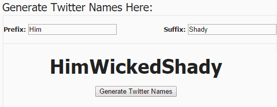 Name Generator is another simple Twitter username generator on my list. You can also use it to randomly generate baby names, Japanese name, Xbox gamer tag, Star Wars name, etc. You don’t need to enter any info in this random username generator. Instead, you have to enter a prefix and suffix. It then enters a random English word between the prefix and suffix to generate a new random Twitter username, as you can see in the screenshot above. The only limitation is that it generates only 1 name suggestion at a time. So, you will have to keep on clicking on the “Generate Twitter Names” to get new name suggestions for Twitter.