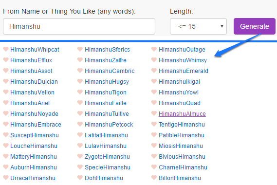 Username Generator is the last online website on my list to get Twitter handle username suggestions. It also does the same thing as other Twitter username generators on my list i.e. generate random names based on your name or things you like the most. Well, it creates numerous usernames in one go and you can then select any one you like. It also lets you specify character length limit of the name to be generated. You have to set this limit to less than or equal to 15 to get valid Twitter usernames in return. Go to the link provided above and then enter your name or some words from which you want to generate username suggestions. After that set, the characters limit and click on the “Generate” button to get random username suggestions for your Twitter profile. The usernames are displayed on the same webpage and you can go through them to find the most suitable for your Twitter account.