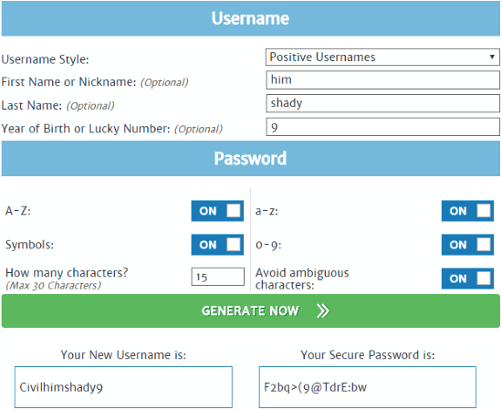 SpeedyPassword is another Twitter username generator. It also generates a random strong password for every Twitter username it suggests. Just like other online Twitter name generators on my list, it generates usernames based on your personal info. Visit the link provided above and then enter your personal info like first name or nickname, last name, etc. In addition to this, you can also apply filters to include/exclude capital and small letters in the random twitter usernames. Most importantly, you can set a character limit of 15 to generate names that comply with Twitter standards. Apart from that, you can also choose to exclude symbols, special characters, etc. from Twitter names to be generated. After you have entered the info and applied rules, click on the “GENERATE NOW >>” button. Do note that it generates only 1 Twitter username at one time, that is displayed right below the “GENERATE NOW >>” button.