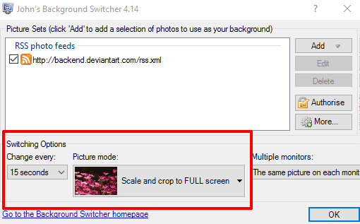 If you are playing image slideshow of RSS photos, then you can also set wallpaper change frequency (10 seconds, 30 seconds, 1 minute, 5 minutes, 30 minutes, 1 hour, 2 hours, 1 day, 2 days, etc.). So you will have the choice how you want to change or show RSS photo as desktop wallpaper. All this can be done using a useful software, called “John’s Background Switcher“. This software lets you add RSS photo feed URL of a photo website (like Tumblr, DeviantArt, etc.) and set output settings. After that, it will work silently in background and show RSS images as desktop wallpaper on PC. Do note that this trick works only for photo sharing websites and communities and not others (say a tech blog).