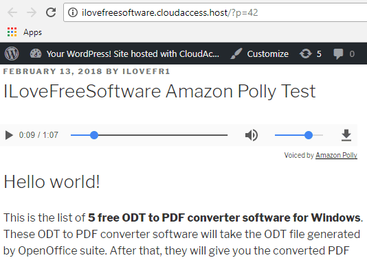 This tutorial explains how to convert WordPress articles to Podcast. Amazon Polly is a plugin for WordPress that you can use to add the audio version of your WordPress articles on top of them. It adds an audio player on the top of articles that you can play and listen to the content of the page in audio form. Also, you can customize various options to change the sample rate, speech name, position of the player, enabling Amazon Polly on new articles by default, and some others. It gives your readers a freedom to stream your articles and even download that in MP3 format. It gives a podcast URL that you can distribute and the users can use that in any podcast plugin or podcast downloader software.