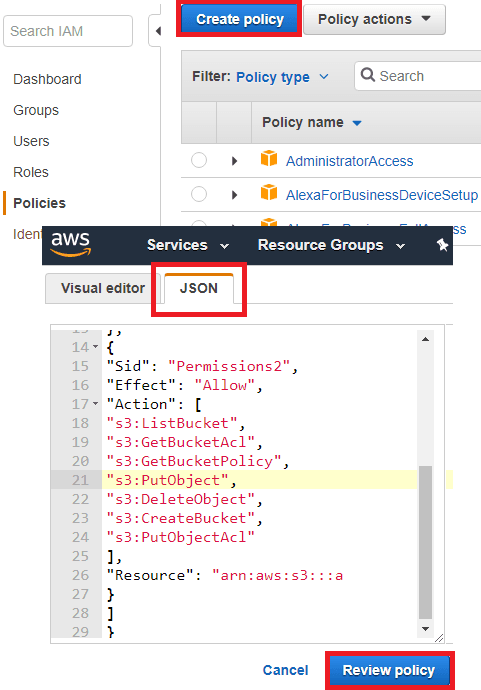 Step 3: In the Policies section, create a new policy by clicking on “Create New Policy” button. After that, Select JSON tab and paste the following code there.