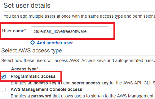 Step 5: Now, we have to create an IAM user. Go back to the IAM page in the step 2. After that, click on Users label. Click on “Add User” button and then specify a name of the user and select “Programmatic Access”.