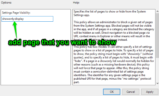 Step 4: In Settings Page Visibility box, you need to add PageURI that you want to hide. For example, if you want to hide “Display” page of System category, then you have to enter “hide:display” in that box. Save your changes and then open Settings app. You will notice that Display page is hidden now.