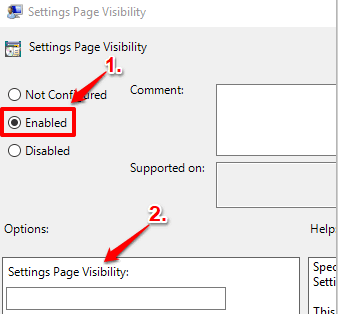 Step 3: When Settings Page Visibility window is opened, "Disabled", "Not Configured", and "Enabled" options will visible. Click Enabled and Settings Page Visibility box will activate.