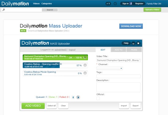 DailyMotion Mass Uploader is a free tool to batch upload videos to the DailyMotion website. DailyMotion is providing competition to YouTube in the video hosting arena. DailyMotion allows slightly better categorization of uploaded videos. Being newer, it also doesn’t have the lag that YouTube has due to the millions of visitors per hour it receives. The DailyMotion Mass Uploader is a tool that will allow you to batch upload videos to DailyMotion.