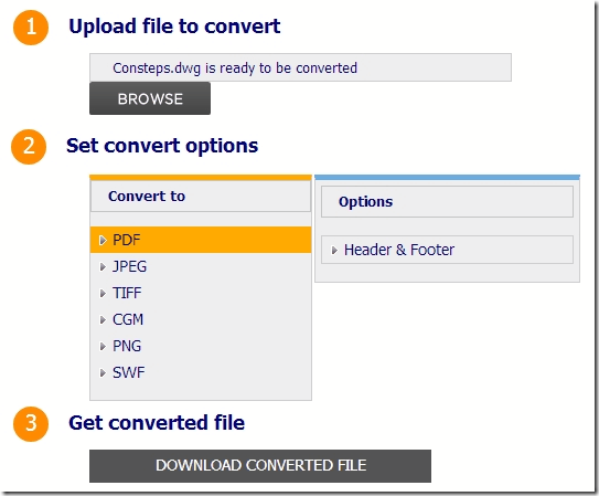 All you need to do is simply upload the DWG file and wait until uploading is finished. Then select the PDF format from the “Set convert options”. In addition to this, you can also add Header & Footer to converted PDF file, if required.