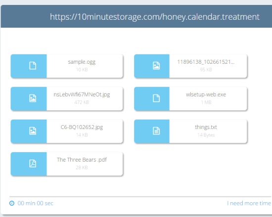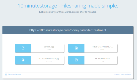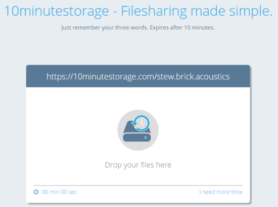 Here is a very interesting website to share files online, named 10minutestorage. Yes, you heard it right! This website gives you storage space for 10 minutes to share any type of file. You can create your private room and each individual room has a unique URL, which remains valid only for 10 minutes. In those 10 minutes, you can upload multiple files and share the room URL. Anyone who has the room URL can access and download all the files available in that room. When the time is over, you room is expired, and you need to create a new one.