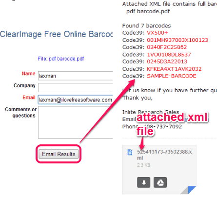 It is quite interesting feature that helps to save generated barcodes to PC as well as download XML file that provides detailed barcode reading results. For downloading the barcode and image data, use the available option, and provide your name & email address. Then you will receive an email which will show you found barcodes as well as XML file to download.