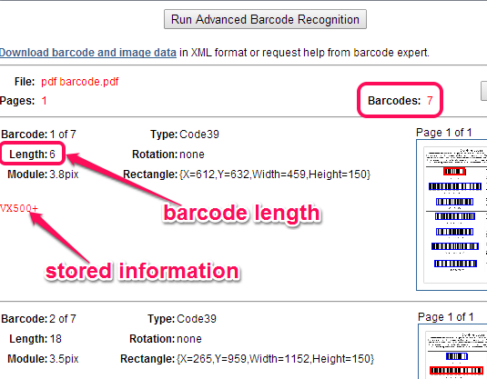 I uploaded a PDF file with multiple barcodes, and it successfully found available information present in each barcode, as you can see in screenshot below.
