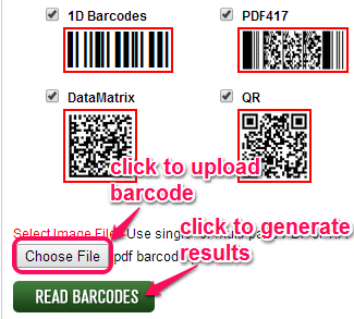 On its homepage, first select barcode types that you want to decode. If an image, say PDF file, has multiple pages with different barcodes, then option to select multiple barcodes is really beneficial. Once you have selected the barcodes, use Choose File button, and upload a barcode saved on your PC.