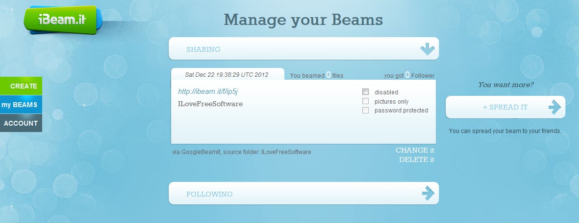 iBeam.it let’s you effortlessly share files with your friend’s online file sharing service. Regardless of the service that your friend is using, you can share your files with them. Suppose, if you are using Dropbox, and your friend is using Google Drive, then you can use this online application to share files between these services.