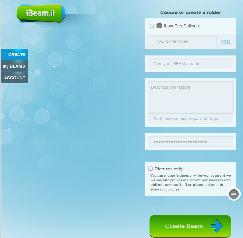 When you have access to your account, you’ll be offered to set up “beam” which is basically a transfer job. During setup you can create a folder on the selected service which will be shared. Add name, description, and if you want you can even password protect what you share, so that only those who know the password can transfer the files. When you’re done with the setup, click on the Create Beam button.