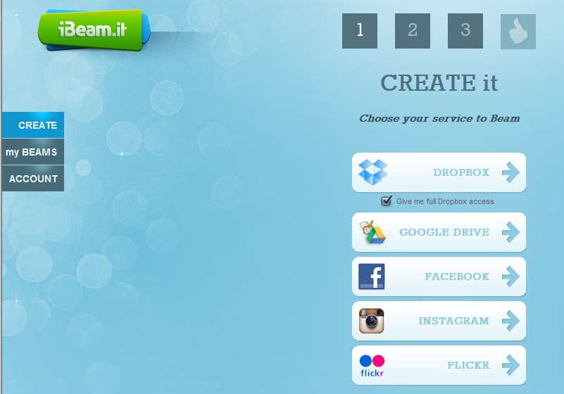 iBeam.it also allows you to sync files between your own different file sharing services like Dropbox, Google Drive, Facebook, Instagram, etc.