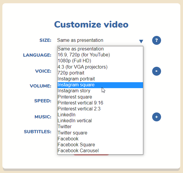 The follow-up step is to customize the video where the additional features can be seen. Here, you can edit the screen dimensions of the video, slides, and the language input (other than English).